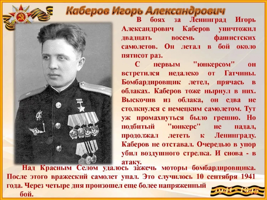 Igor Alexandrovich Kaberov is a Hero of the Soviet Union, an honorary citizen of Veliky Novgorod. I. A. Kaberov flew 397 combat missions. In 92 air battles, he personally shot down 10 enemy aircraft and 18 in a group, rammed an I-16 at the beginning of the war. On June 24, 1943, he was awarded the title Hero of the Soviet Union for his courage and military valor shown in battles with enemies. |
